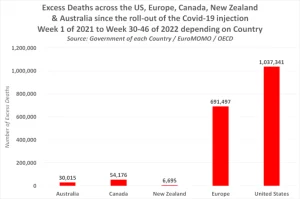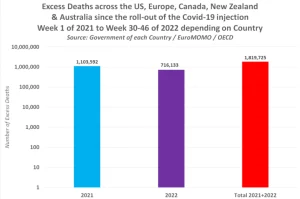 Ova šokantna brojka uključuje preko milion viška smrtnih slučajeva u SAD-u i preko 690.000 viška smrtnih slučajeva u Evropi prema Centrima za kontrolu bolesti i Organizaciji za ekonomsku saradnju i razvoj, kao i značajan broj viška smrtnih slučajeva u Australiji, Kanadi, i Novi Zeland.