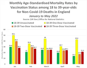 Alarmantno je videti brojke koje se nalaze u izveštaju koji je objavila Vlada Ujedinjenog Kraljevstva pod naslovom „ Smrtni slučajevi od vakcinacije, Engleska, od 1. januara 2021. do 31. maja 2022. “, a kojima može da se pristupi na strani ONS-a ovde , a da se preuzme ovde , da svakog meseca između januara i maja 2022. godine, osobe u dobu od 18 do 39 godina koje su bile delimično ili potpuno vakcinisane, su imale veću verovatnoću da će umreti od ne-kovid uzroka u poređenju sa svojim nevakcinisanim sunarodnicima.