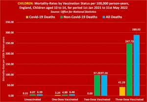 To znači, prema službenim podacima britanske vlade, dvostruko vakcinisana deca imaju 1.422% ili 15,22 puta veću verovatnoću da će umreti od bilo kog uzroka nego nevakcinisana deca, dok je kod trostruko vakcinisane dece 4.423% ili 45,23 puta veća verovatnoća da će umreti od bilo kog uzroka nego nevakcinisana deca.