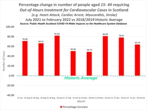 Ovo je verovatno razlog zašto je istraživanje službenih podataka, koje je javno zdravstvo Škotske objavilo u aprilu 2022., pokazalo da je došlo do povećanja od 67% u odnosu na istorijski prosek u broju ljudi starosti od 15 do 44 godine koji su doživeli srčani udar, srčani zastoj, miokarditis, moždani udar i druge kardiovaskularne bolesti, jer je ovoj starosnoj grupi ponuđena vakcina protiv Kovida19.
