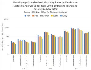 Sledeća dva grafikona prikazuju mesečne stope smrtnosti standardizovane po starosti prema statusu vakcinacije za ne-kovid smrtne slučajeve u Engleskoj između januara i maja 2022. za sve starosne grupe –