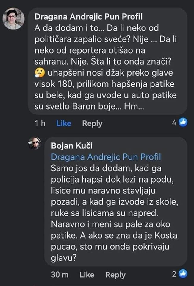Поред различитих патика на којима после толиког масакра нема капи крви, сад осумњичени више на рукавима нема пруге и из неког разлога су Косту у тај минут и по одвезали и руке му свезали с преда.