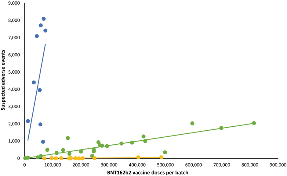 Zatim postoje ‘plave serije’ grupisane oko plave linije, koje su očigledno povezane sa izuzetno visokim nivoom neželjenih događaja. Kao što Diker primećuje, u Danskoj nije dato više od 80.000 doza bilo koje od plavih serija – što sugeriše da su ove posebno loše serije možda tiho povučene sa tržišta od strane javnih zdravstvenih institucija.