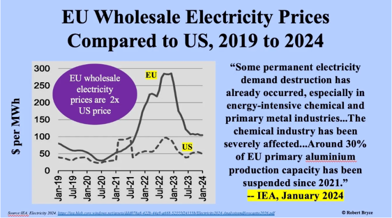 Tokom većeg dela poslednjih 50 godina, Evropa se sistematski demontirala i ekonomski i kulturno. Usvojeni su zakoni, propisi i mandati koji su bili neprijateljski raspoloženi prema fosilnim gorivima i nuklearnoj energiji. Strogi klimatski i ekološki standardi samo povećavaju troškove proizvodnje, istovremeno smanjujući konkurentnost evropskih proizvoda za izvoz.